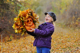 child-a little girl in a cap and purple jacket screams feigning fright and holds a pumpkin Jack's lantern with a wreath of leaves on the background of the autumn forest