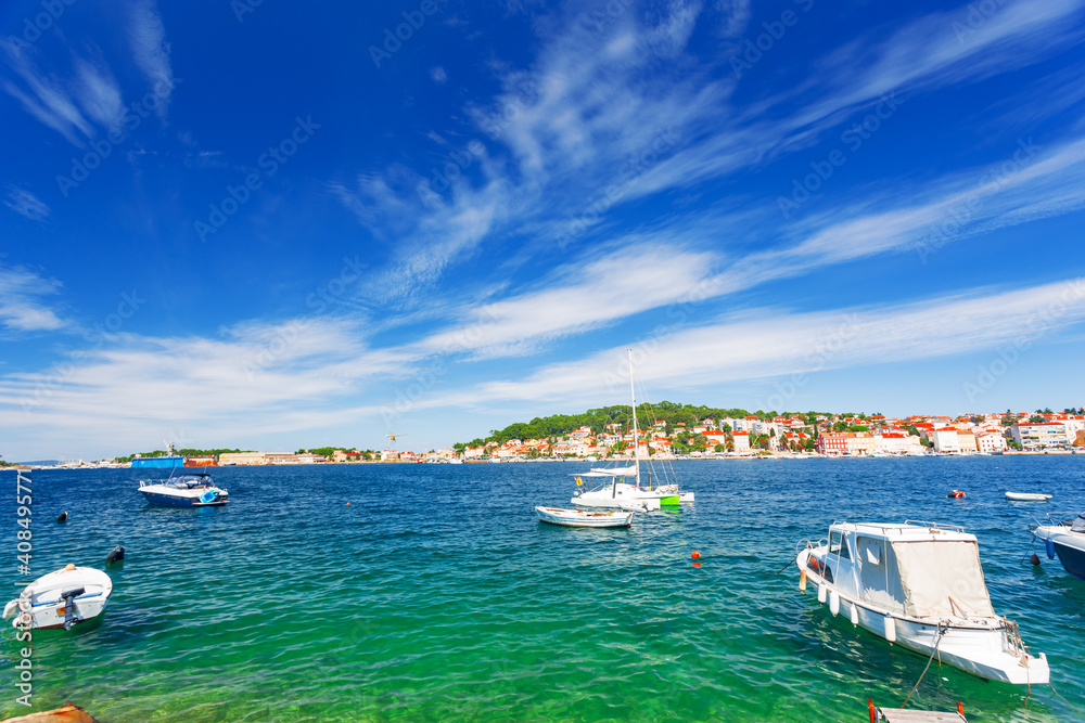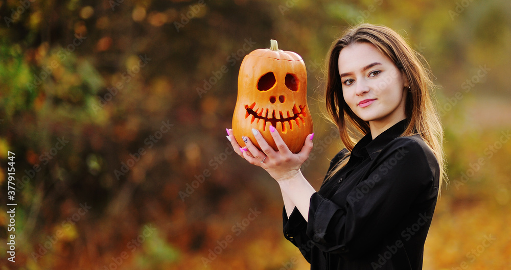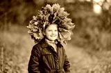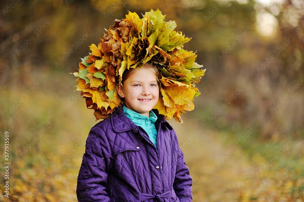 a child-a little girl in a cap and purple jacket with a wreath of yellow autumn leaves on her head smiles against the background of the forest.