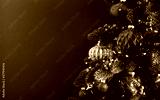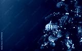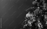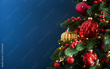 Decorated with ornaments and lights Christmas tree on blue background. Merry Christmas and Happy Holidays greeting card, frame, banner. New Year.