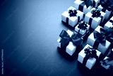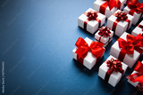 Merry Christmas and Happy Holidays greeting card, frame, banner. New Year. Noel. Christmas gift on blue background top view. Winter xmas holiday theme.
