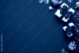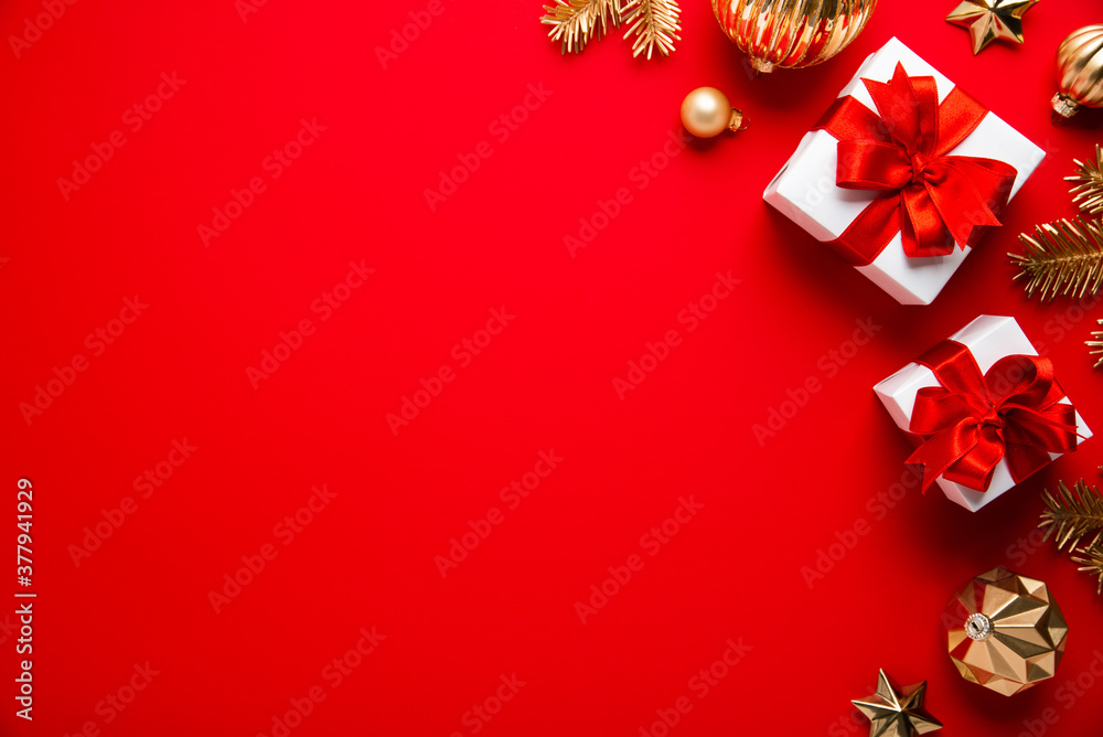 Merry Christmas and Happy Holidays greeting card, frame, banner. New Year. Noel. Christmas ornaments and gift on red background top view. Winter xmas holiday theme. Flat lay
