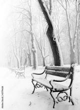 Red benches in the fog in winter