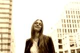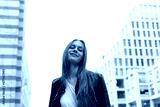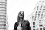 Confident young woman from below looking down at camera. Pretty girl with blonde hair wearing black faux leather jacket. Low angle shot.