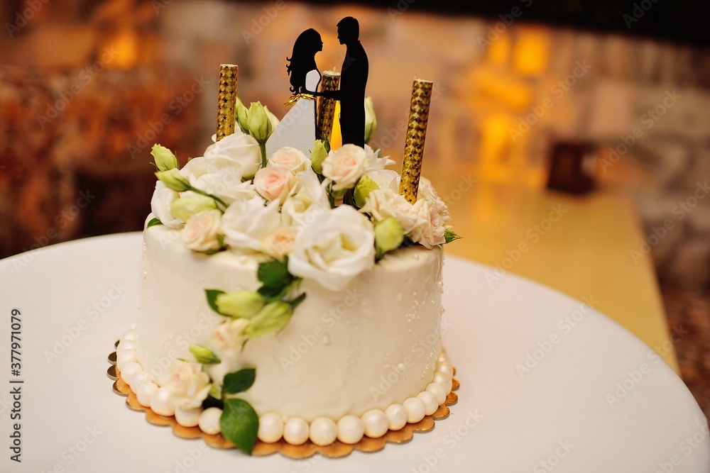 beautiful white wedding cake decorated with flowers and roses with black figures of the bride and groom. Wedding decor