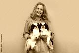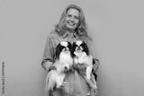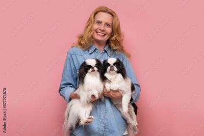 caucasian woman holding and comforting two pet dogs japanese chins.
