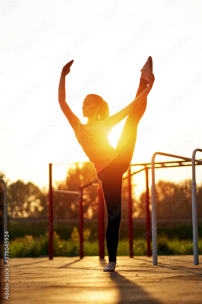 Stretching fit or dancer woman doing vertical split, twine in workout sports ground. Dancer silhouette at sunset