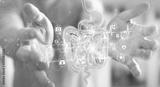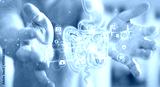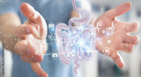 Man using digital x-ray of human intestine holographic scan projection 3D rendering