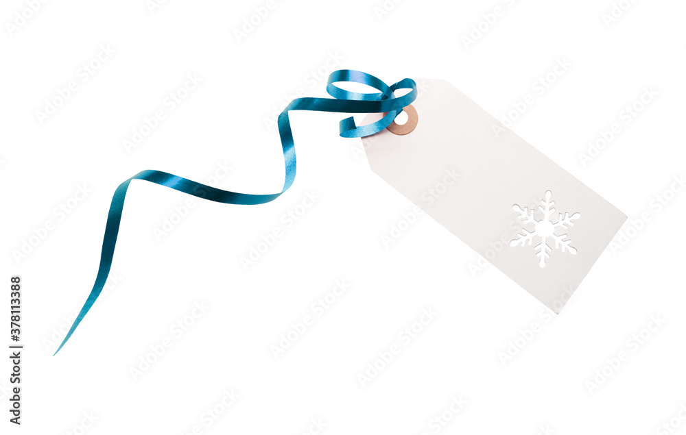 Gift tags and label template with blue ribbon attached to add to presents, Christmas or birthday gifts isolated against a white background.