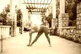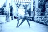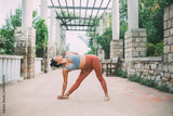 Fit young woman doing Baddha Trikonasana pose during yoga workout