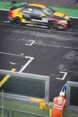 Racing car run fast in a blurred motion on racing track with sport crew man in the foreground