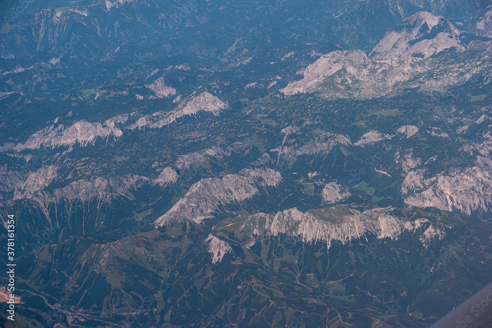 Airplane view of mountain range landscape over Europe cloudy summer day