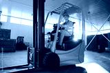 Delivery concept. Driver at warehouse in forklift