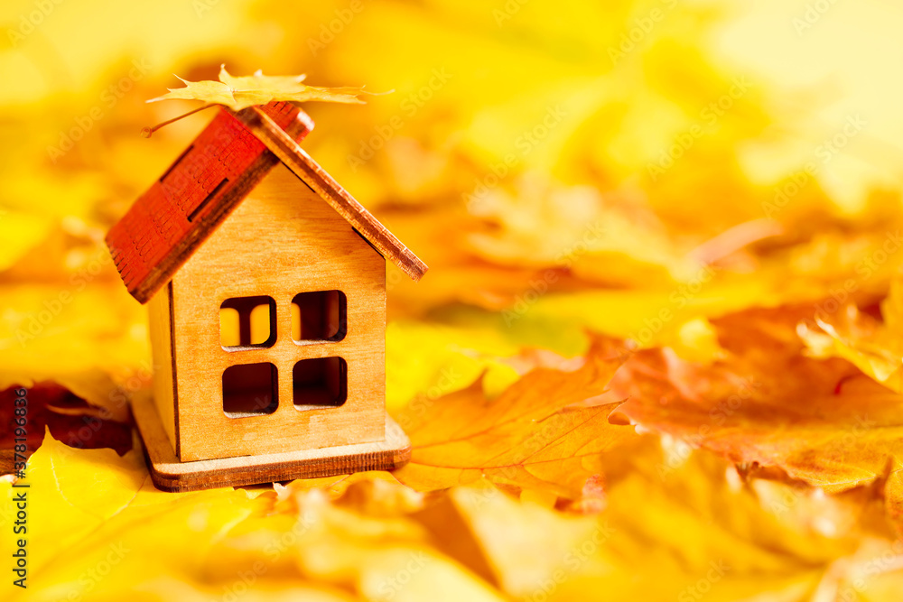 Small decorative wooden house on bright yellow autumn foliage, close up, copy space, soft focus. Conceptual image of buying, selling, renting real estate, housing, dreams of a house in the village