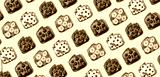 Pattern with set of different sweet sandwiches: with chocolate butter, peanut butter, soft cheese, berry curd, decorated with fruits and berries. Light blue background. Top view. Flat lay.