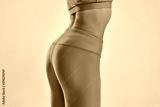 Close up shot of photo of a muscular slim woman with perfect buttocks posing isolated over grey background