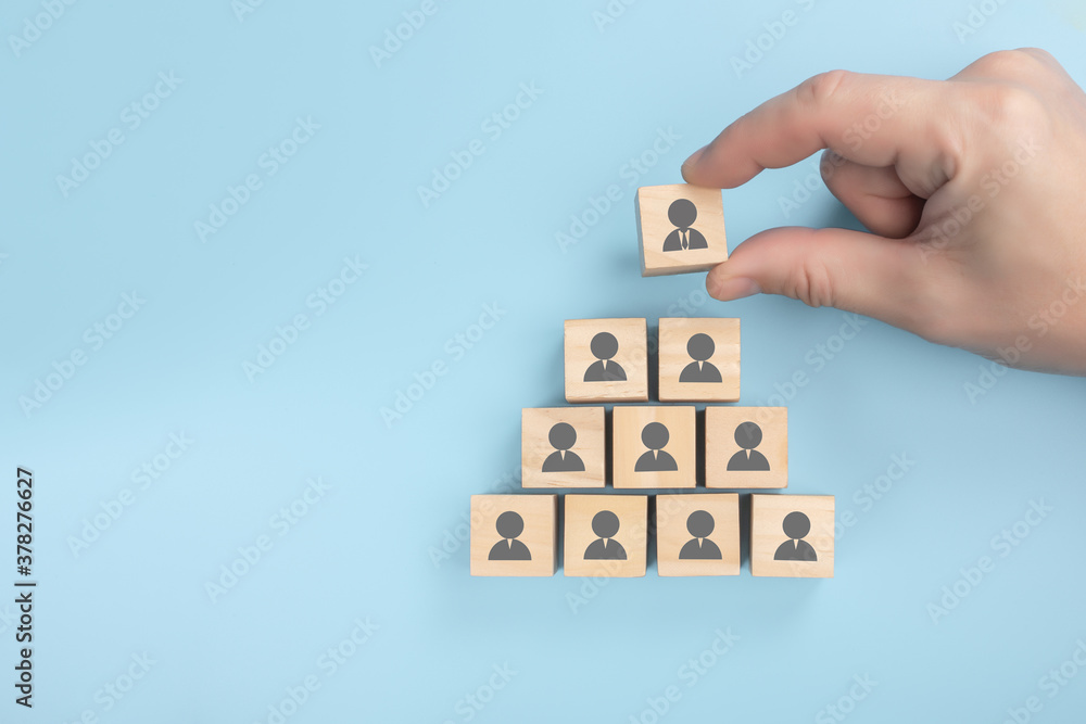 personnel pyramid. Human resources, corporate hierarchy concept and multilevel marketing - recruiter complete team represented by wooden cube by one leader person