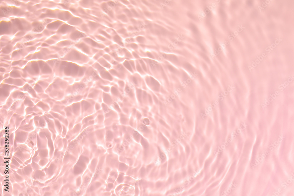 Closeup of pink transparent clear calm water surface texture with splashes and bubbles. Trendy abstract summer nature background. Coral colored waves in sunlight.