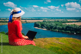 remote work - young woman working with laptop in the country