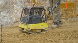 CLOSE UP Man uses manual levelling machine to prepare ground for mortar pouring