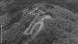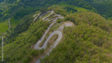 AERIAL: Cinematic shot of a switchback road winding up a forest covered hill.