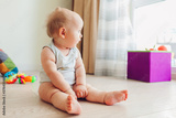 Little newborn baby playing with toys sitting on floor at home. Kid looking at window