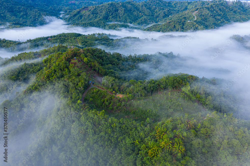 Aerial image of beautiful fresh green nature landscape scene of tropical rainforest and clouds during morning sunrise