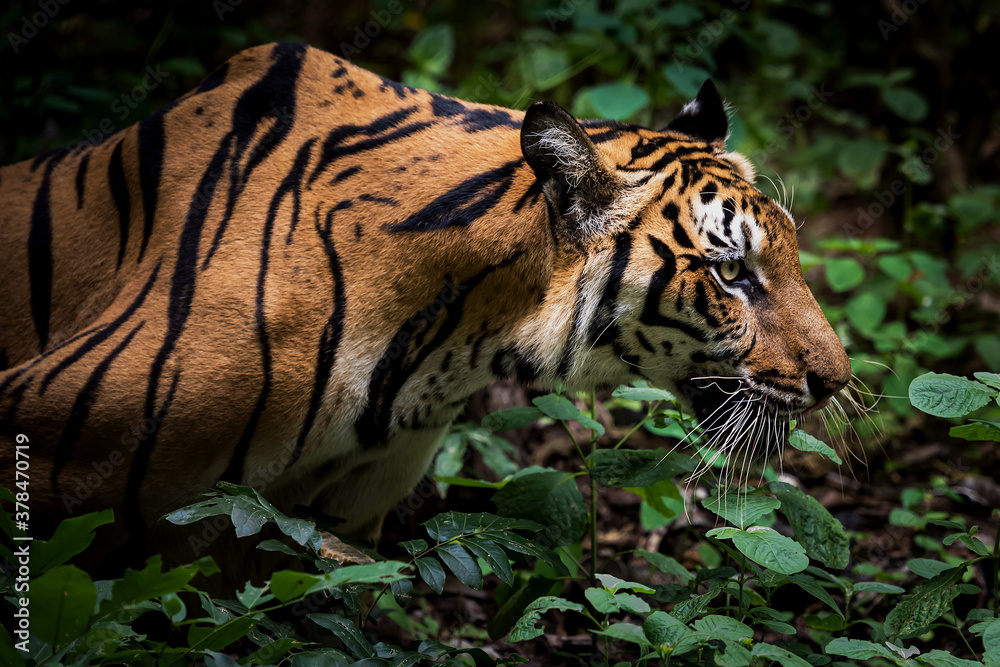 The tiger is crawling towards its prey to hunt for food.
