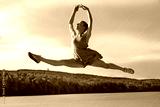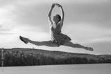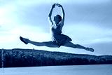 Woman dancer performing air split over a Connecticut reservoir.