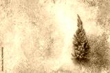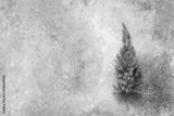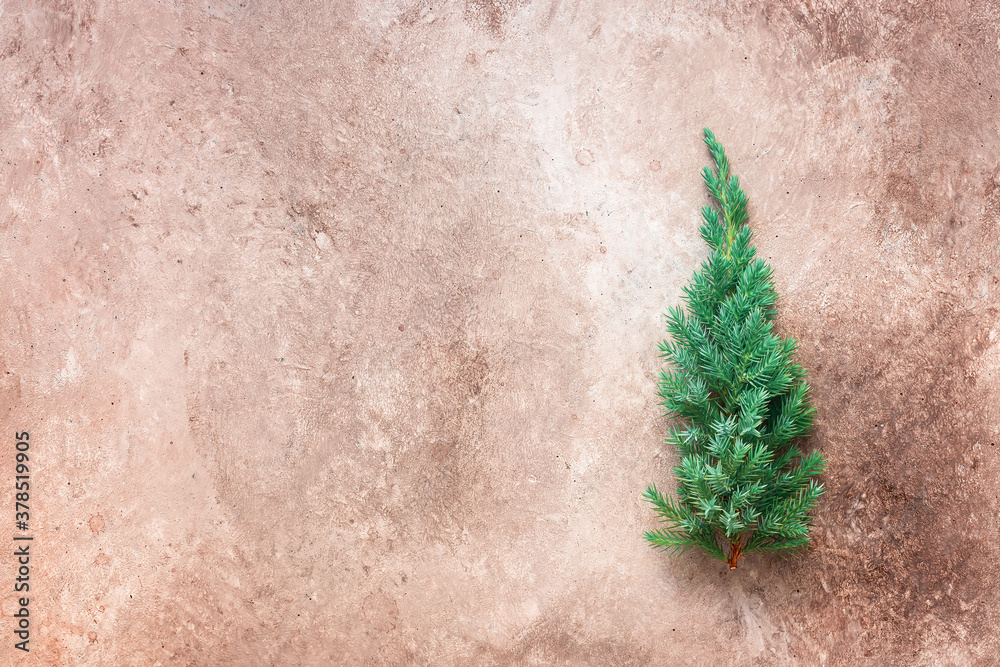 Christmas background with a small Christmas tree. Juniper branch on a beige grunge background. Top view, flat lay, copy space.