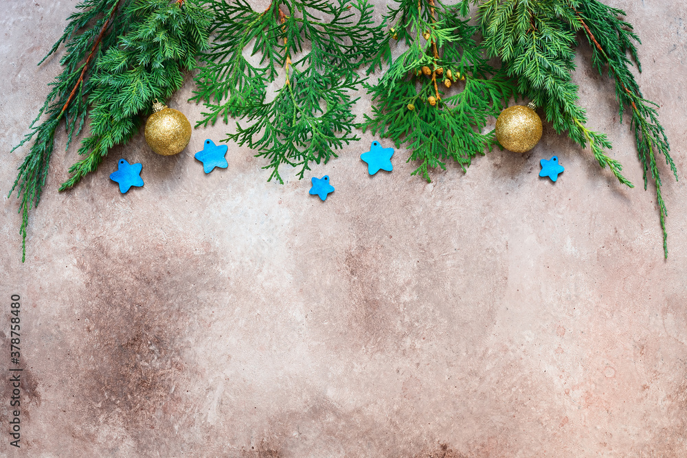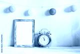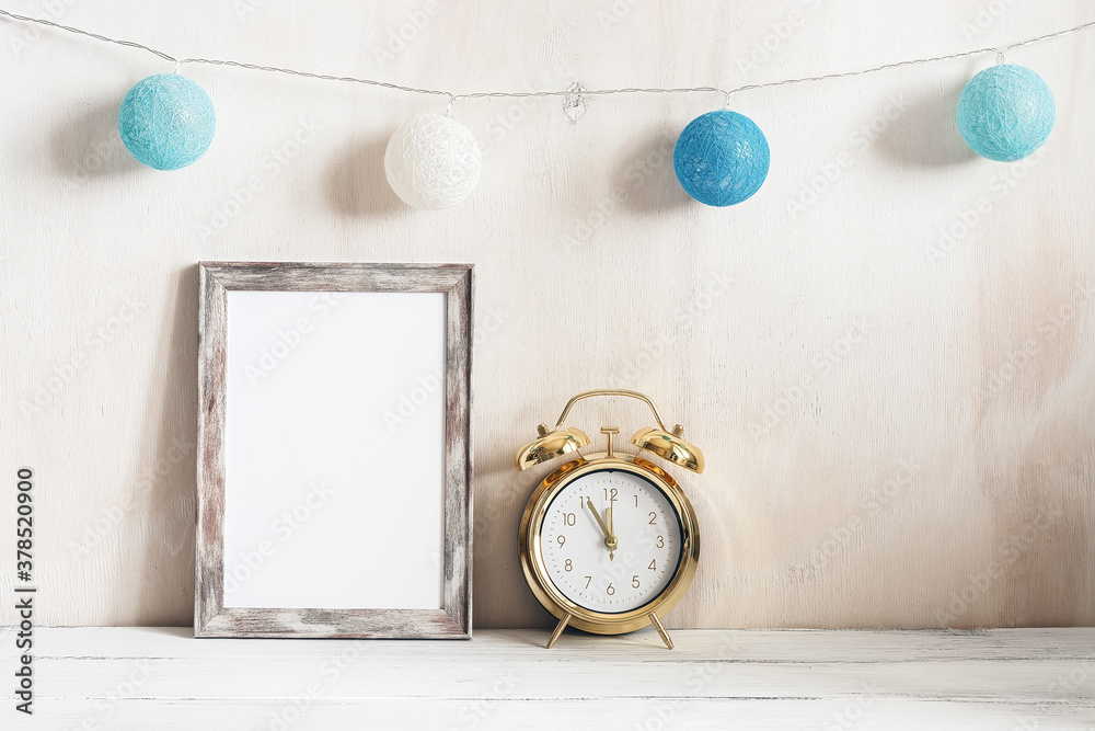 Minimal home christmas decor. Empty portrait frame, golden alarm clock and garland of blue balloons on a white wooden table. Stylish modern template for your design.