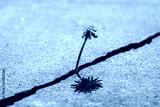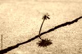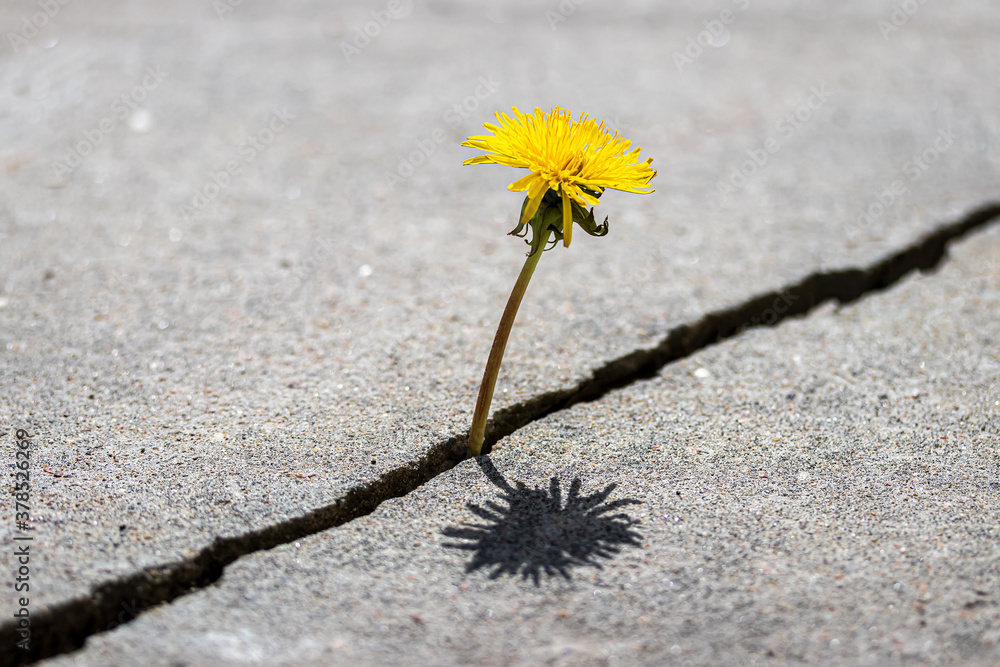 A yellow dandelion flower growing from a crack in concrete or cement. The concept of growth, overcoming difficulties, strength, hope and rebirth.