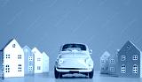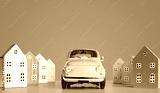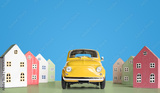 Miniature houses and toy retro yellow car