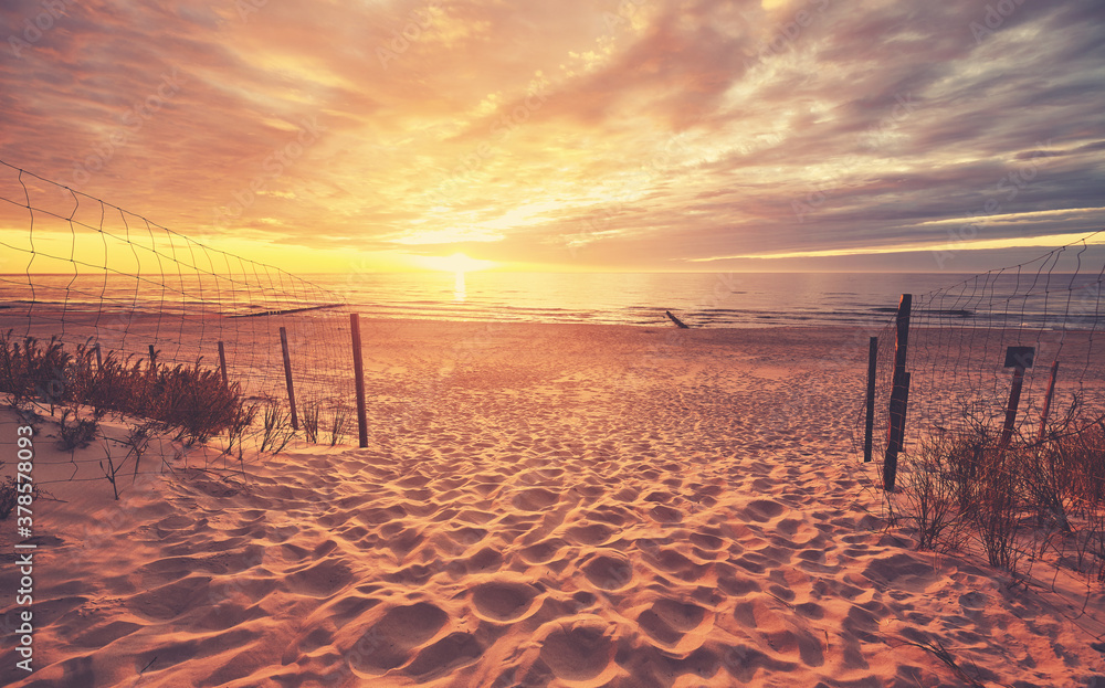 Scenic beach entrance at a beautiful sunset, color toned picture.