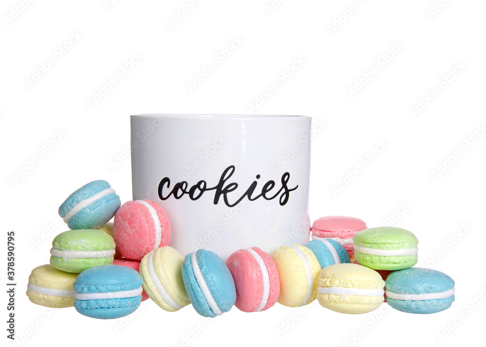 Porcelain cookie jar labeled, with macaron cookies outside the jar in various colors and flavors. Isolated on white.