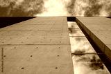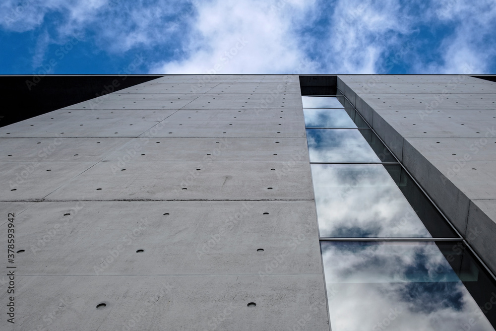 Modern building against blue cloudy sky. Bottom up view. Glass reflection and concrete facade.