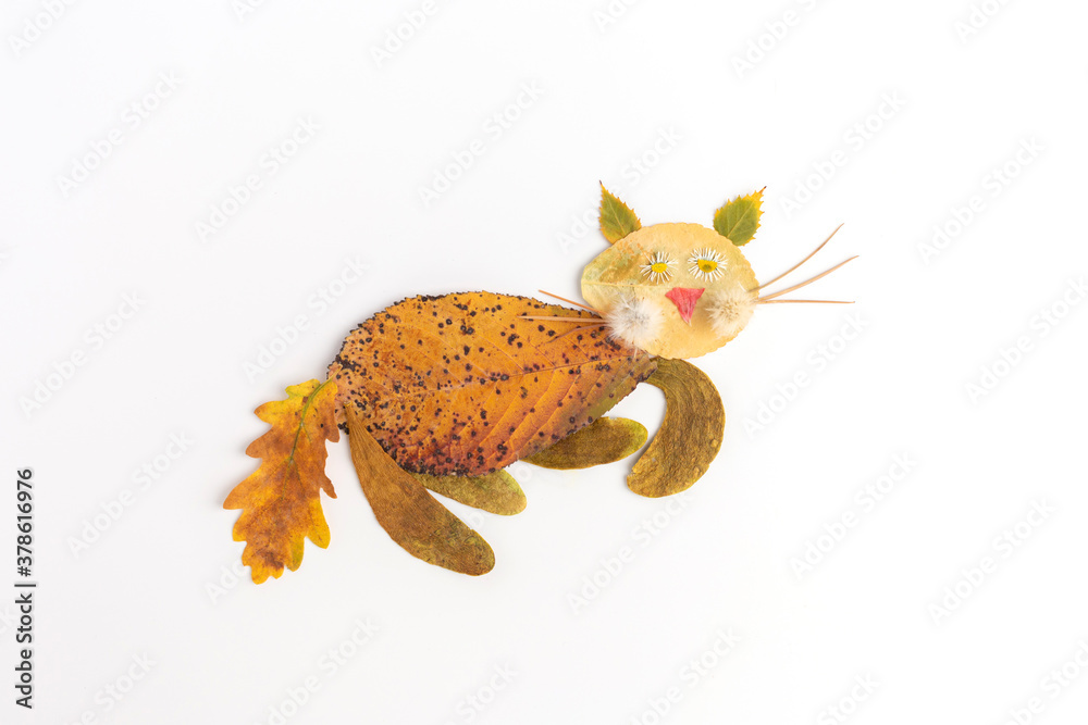 autumn nature craft for kids, cat made of leaf, top view, activity for children. Holiday Decoration