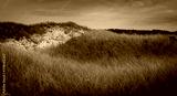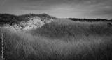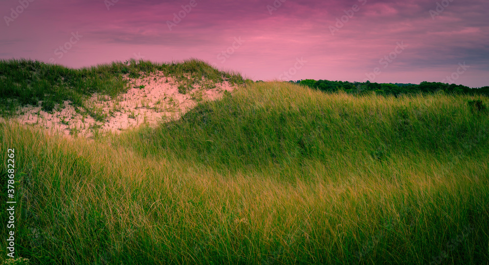 Panoramic sand dune and rolling hill wilderness landscape with growing green grass and erosion at cloudy pink twilight on Cape Cod