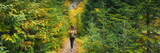 Autumn hike woman walking in pine forest landscape panoramic banner. Hiking in the wilderness panorama.