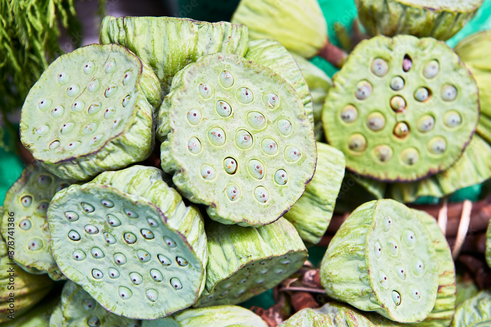 A close-up isolated view of a pile of green lotus seed heads of water lilies for sale at the Klong Toey Market in Bangkok, Thailand, Asia
