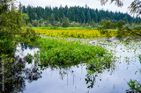 Scenic background view of a lake with surrounding forest at Stanley Park in Vancouver, British Columbia, Canada. It is a quiet place without people.