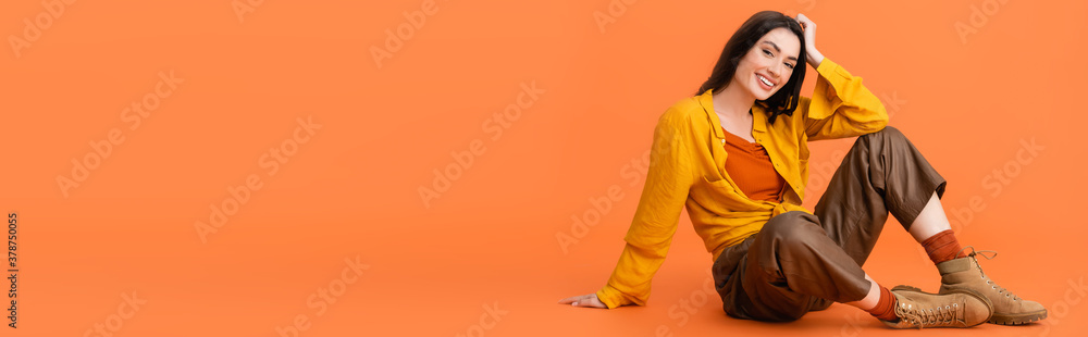 panoramic concept of brunette and trendy woman in autumn outfit sitting on orange