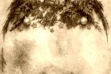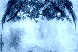Christmas composition, branches of coniferous trees, Christmas balls and blue wooden stars. Beige grunge background. Top view, flat lay, copy space.