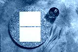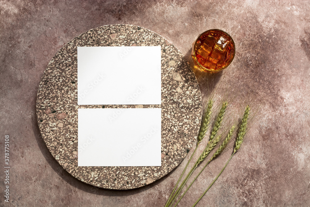 Whiskey glass with ice, blank white business card mockup with elements of granite and ears of wheat. Male background. Alcohol industry template. Top view, flat lay. Beige grunge background.