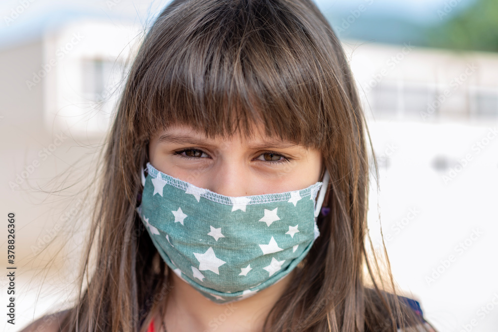 Girl wearing face mask during corona virus and flu outbreak. Worried girl looking at the camera.