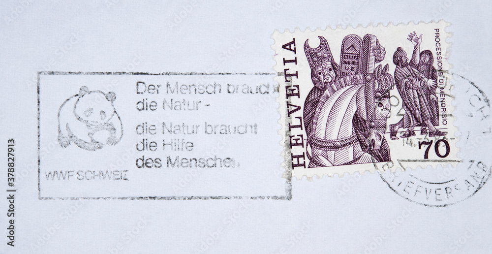 stamp briefmarke retro vintage gestempelt used frankiert post letter mail brief Schweiz Helvetia slogan werbung panda WWF 70 processione di mendrisio pferd kardinal