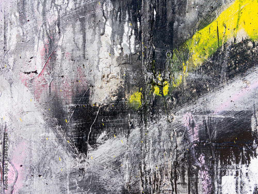 Rough paint dripping, spray paint artwork. Abstract background oil paint painting style. Damage to walls with many colors. Rough concrete surface with cracks, scratches and paint stains