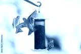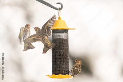birds gathering at the bird feeder in winter. Bird Frenzy over the feeding tube. Horizontal outdoor photography