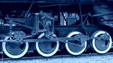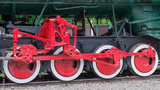 Red and white iron wheel set with coupling rod (side rod) of the old retro steam locomotive close up