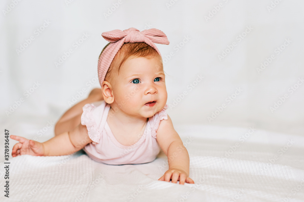 Portrait of adorable red-haired baby lying on belly, white background, wearing pink body and headband, looks to the side