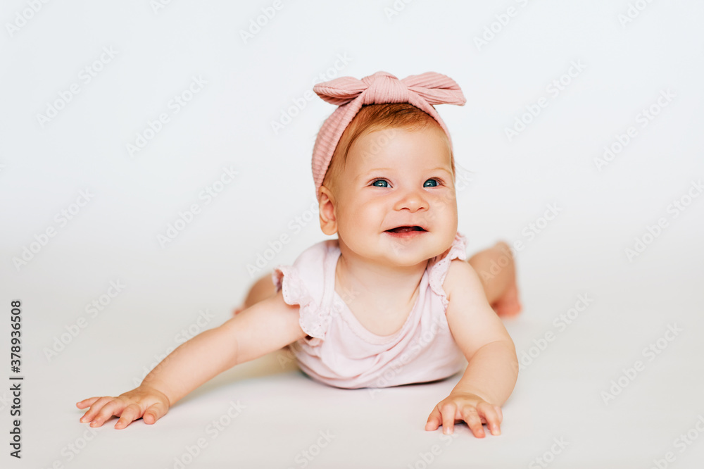 Portrait of adorable red-haired baby lying on belly, white background, wearing pink body and headband, looking up with smile